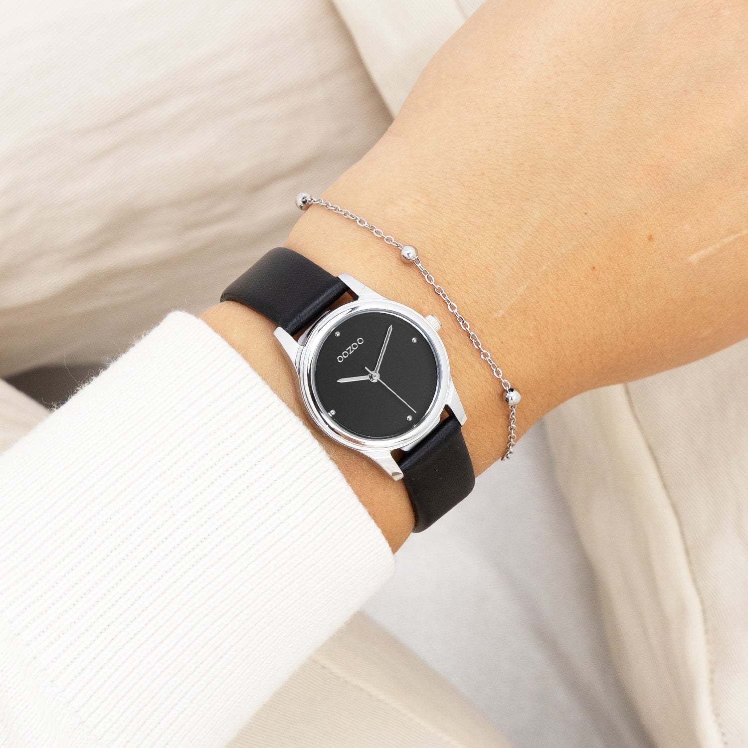 Stand out with this beautiful round ladies design from the trendy OOZOO Timepieces collection. The C11628 has a black leather strap and 28 mm silver coloured metal watch case. You are making quite the fashion statement with this black dial, silver coloured dots digits and matching hands. This essential watch for your wardrobe has a mineral glass, stainless steel backplate and is nickel safe. This watch has a 2ATM Japanese movement and is covered by a 2 year warranty (see section 3 of our Refund, shipping & warranty policy).