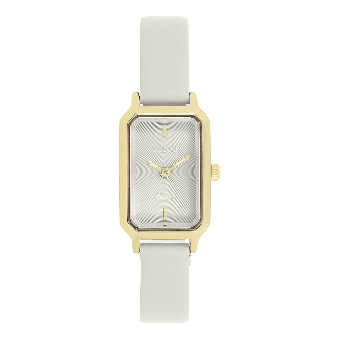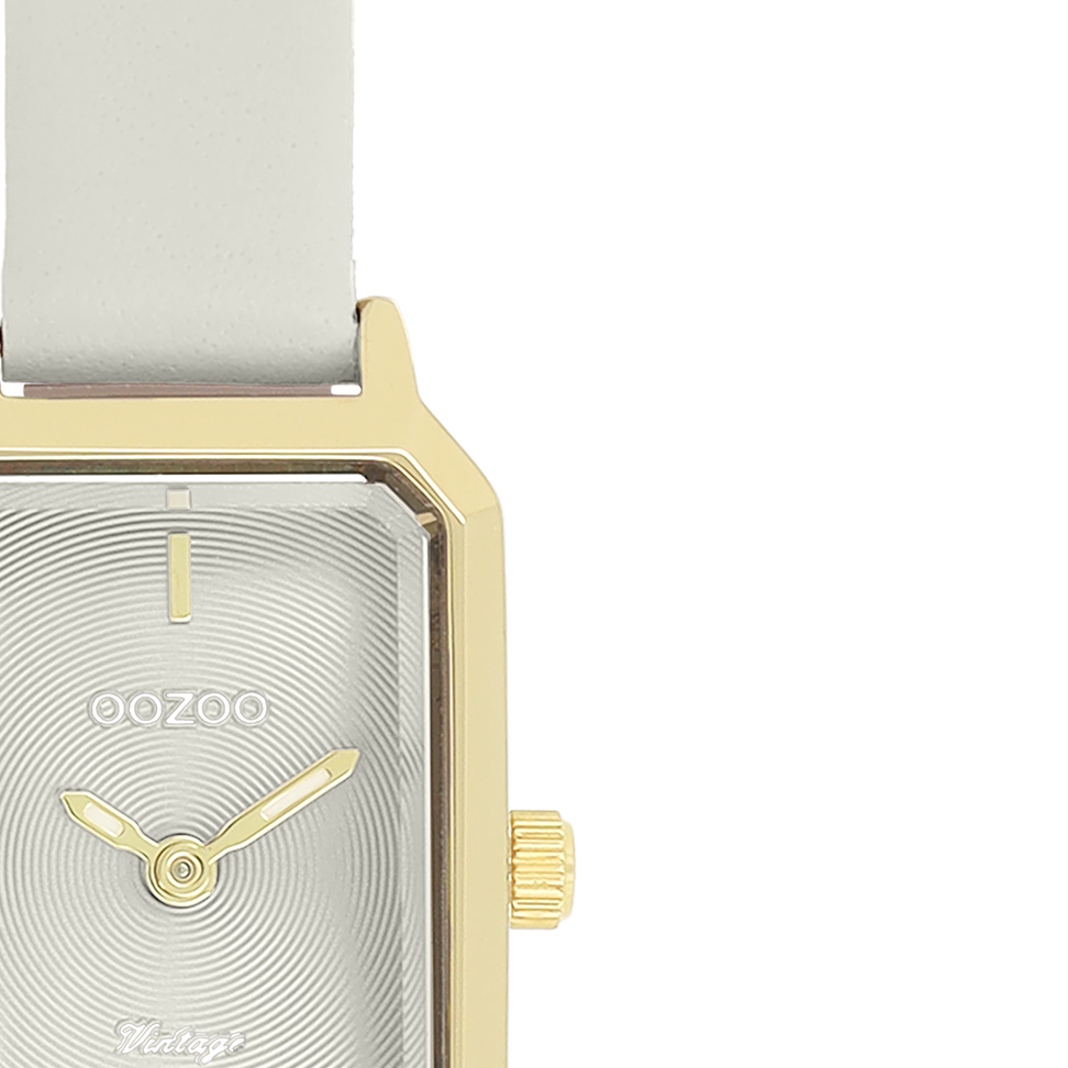 The classic look stays key in this trendy series and therefore, this rectangular OOZOO vintage design with a playful wink is the season must-have! This ladies watch is the perfect combination of fashion and comfort with its 22x19 mm gold coloured metal watch case and light grey circle pattern dial. The light grey leather strap makes this watch a trendy accessory, which you can wear every day. The dial has gold coloured stripes digits and matching hands. The C20451 adds the sparkle to your outfit. The mineral glass lays in a 9,5 mm slim metal watch case with IP-plating. This design has a stainless steel backplate and is nickel safe. This watch has a 2ATM Japanese movement and is covered by a 2 year warranty (see section 3 of our Refund, shipping & warranty policy).