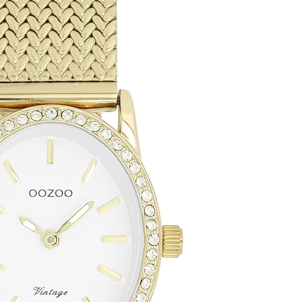 The classic look stays key in this trendy series and therefore, this oval OOZOO vintage design with a playful wink is the season must-have! This ladies watch is the perfect combination of fashion and comfort with its 28x23 mm gold coloured metal with crystals watch case and white dial. The gold coloured metal v-mesh bracelet makes this watch a trendy accessory, which you can wear every day. The dial has gold coloured stripes digits and matching hands. The C20432 adds the sparkle to your outfit. The mineral glass lays in a mm slim metal watch case with IP-plating. This design has a stainless steel backplate and is nickel safe. This watch has a 2ATM Japanese movement and is covered by a 2 year warranty (see section 3 of our Refund, shipping & warranty policy).