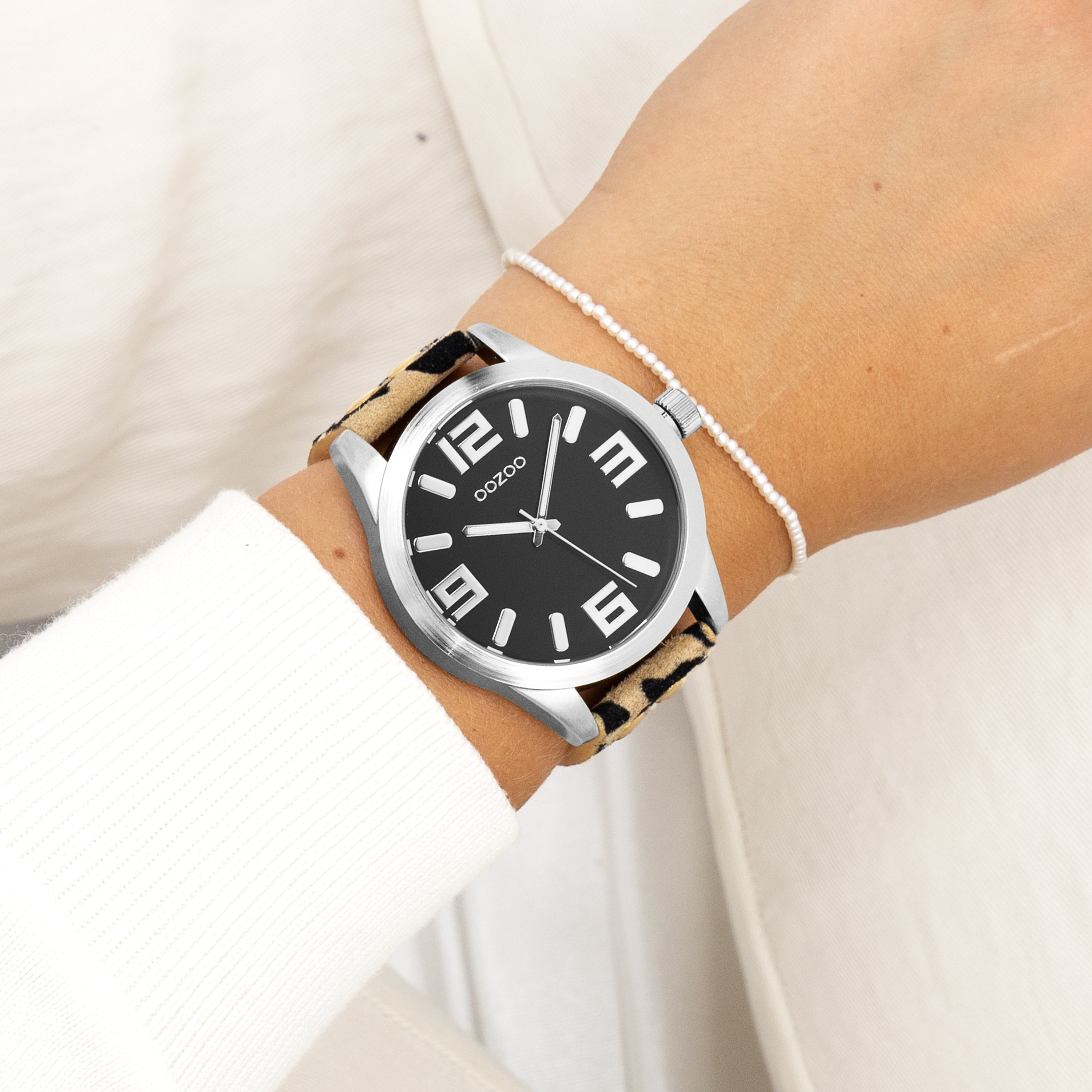 Destaca con este hermoso diseño redondo para damas de la moderna colección OOZOO Timepieces. El C0901 tiene una correa de cuero marrón con estampado de leopardo y una caja de reloj de metal plateado de 46 mm. Estás haciendo una gran declaración de moda con esta esfera negra, rayas y números plateados y manecillas a juego. Este reloj esencial para tu guardarropa tiene un cristal mineral, una placa trasera de acero inoxidable y es seguro para personas alérgicas al níquel. Este reloj cuenta con un movimiento japonés 2ATM y está cubierto por una garantía de 2 años (ver sección 3 de nuestra política de reembolso, envío y garantía).