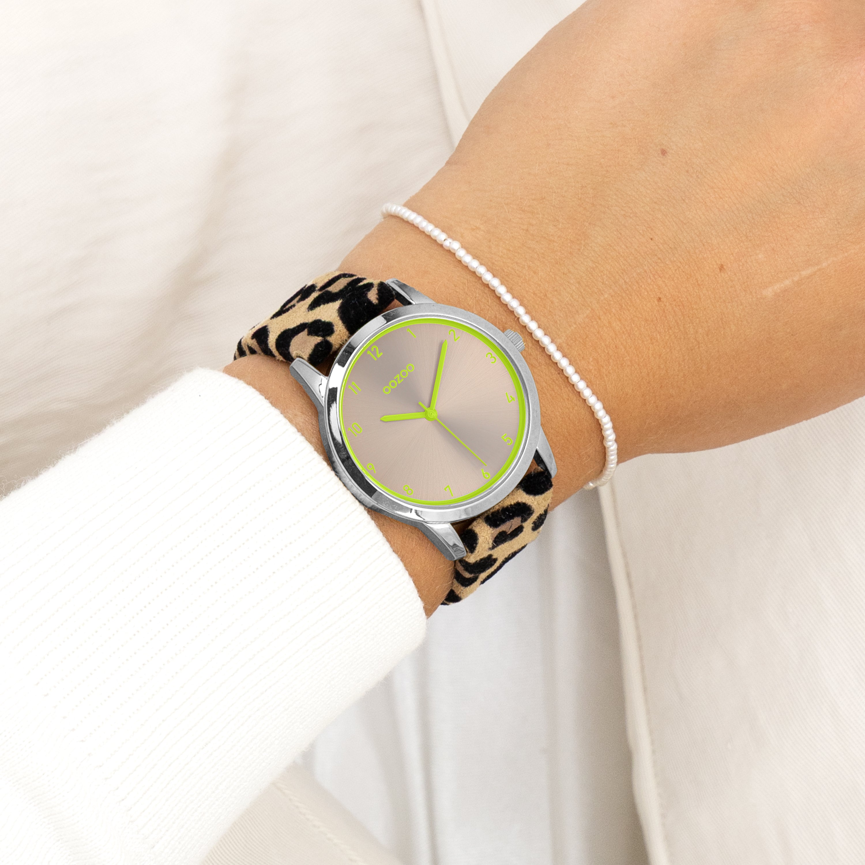 Stand out with this beautiful round ladies design from the trendy OOZOO Timepieces collection. The C11645 has a leopard print brown leather strap and 38 mm silver coloured metal watch case. You are making quite the fashion statement with this taupe sunray dial, fluo green numbers digits and matching hands. This essential watch for your wardrobe has a mineral glass, stainless steel backplate and is nickel safe. This watch has a 2ATM Japanese movement and is covered by a 2 year warranty (see section 3 of our Refund, shipping & warranty policy).