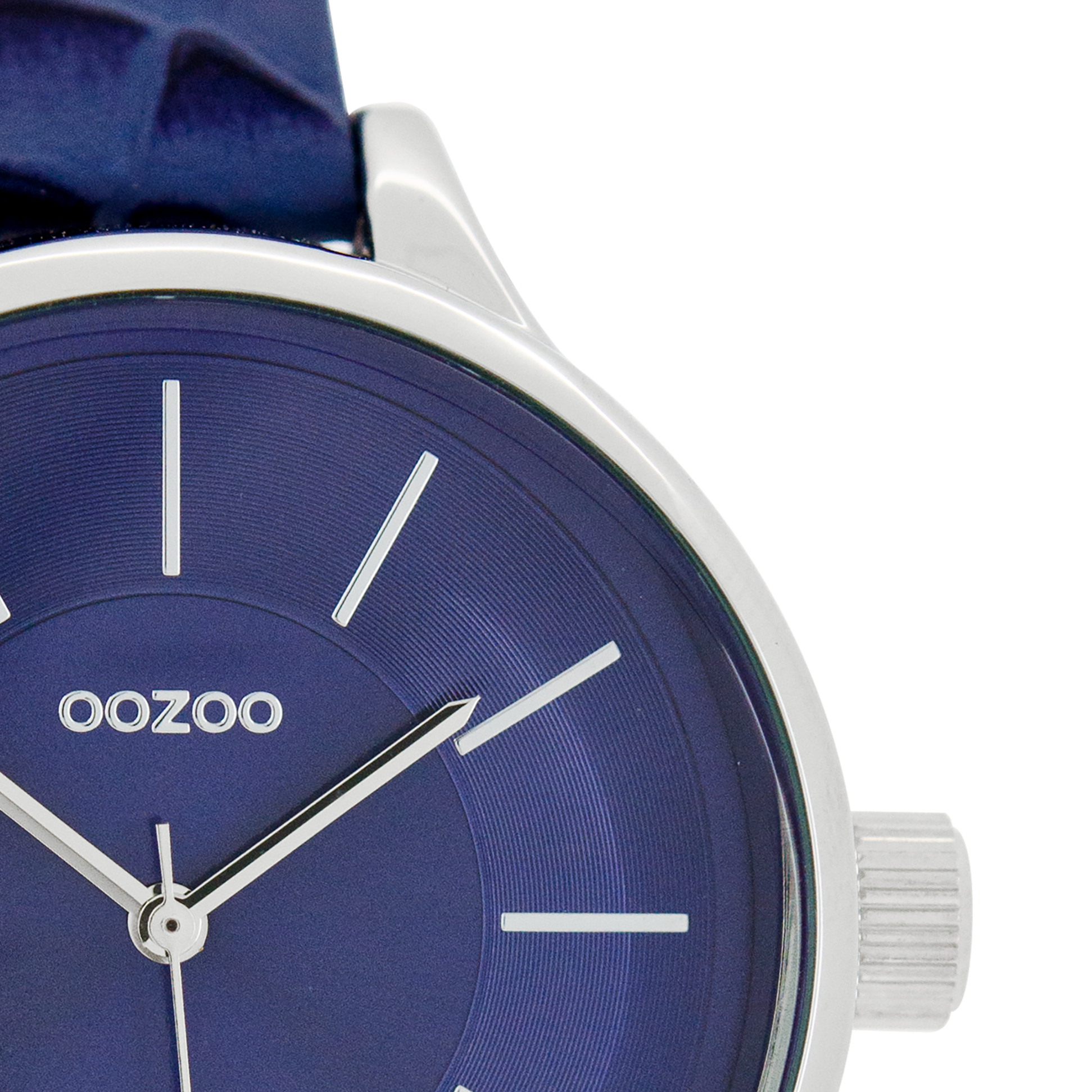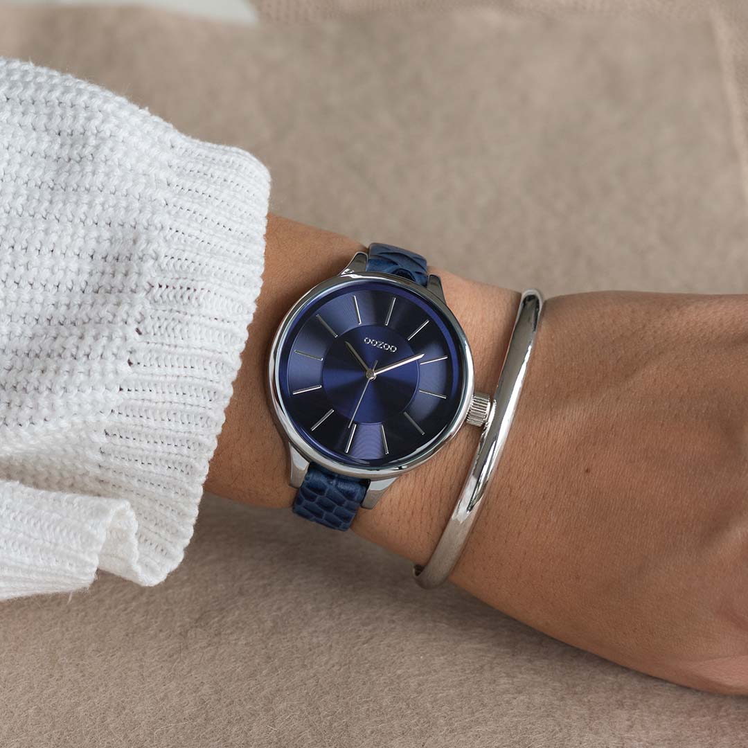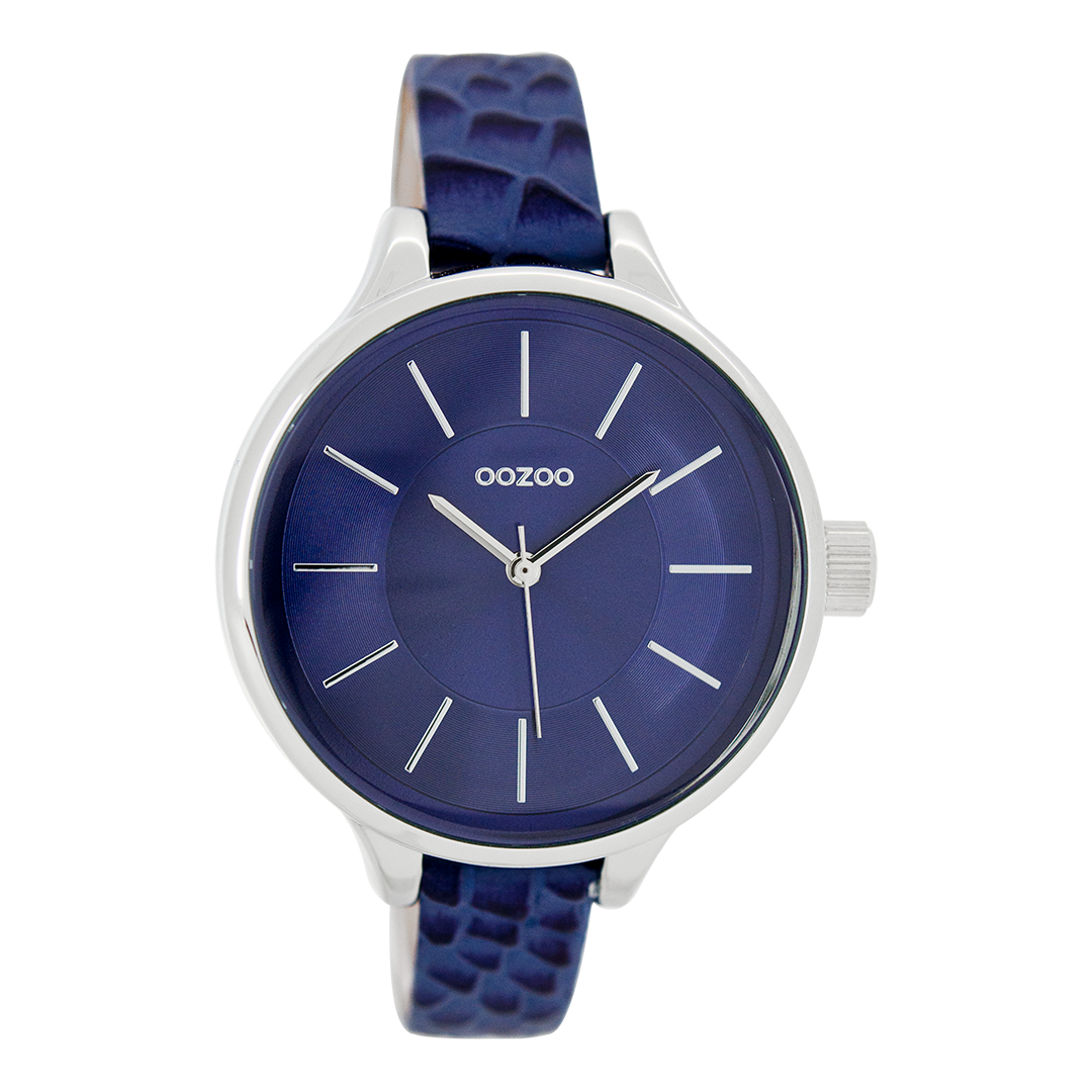 Silver coloured OOZOO watch with dark blue leather strap - C7548